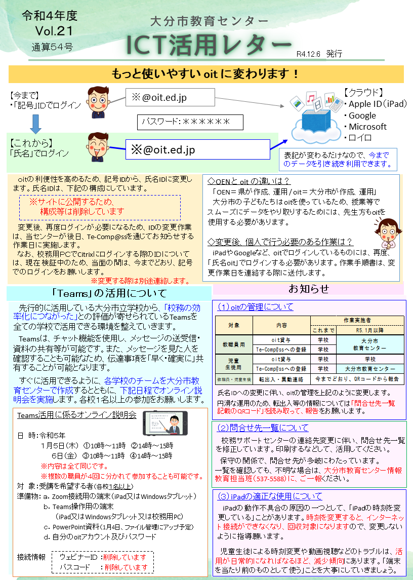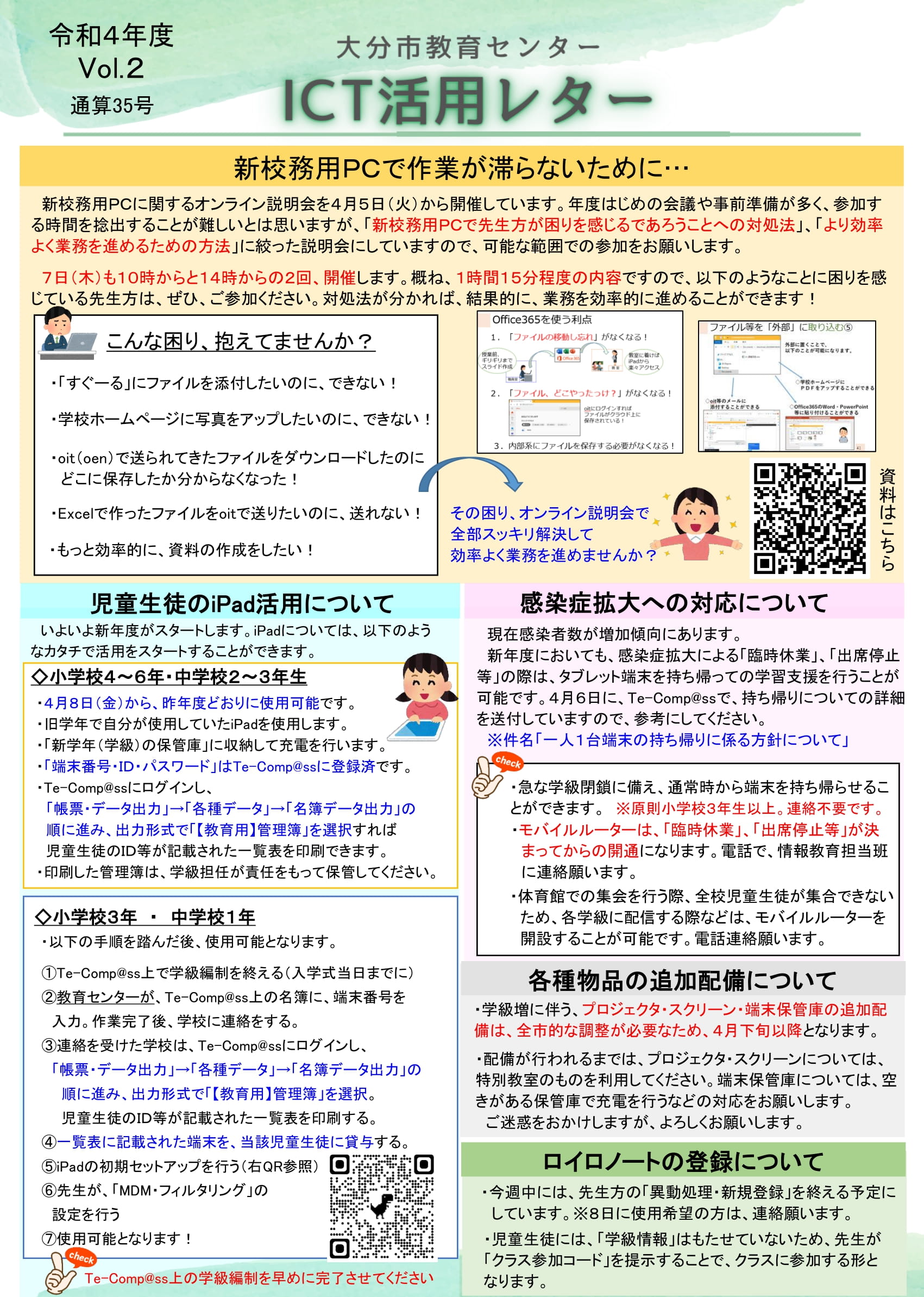 いよいよ令和4年度がスタートしました。教育用・校務用、それぞれがスムーズに運用開始できるように、留意点等を紹介していますので、ご覧ください。